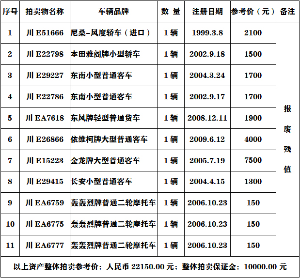 二、注意事項(xiàng):參與報廢車輛的競買人必須具有收取報廢車輛的相關(guān)資質(zhì)。